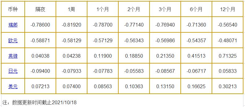 1个月LIBOR:瑞郎报-0.78700%,欧元报-0.57129%,英镑报0.11900%,日元报-0.07783%,美元报0.08563%。