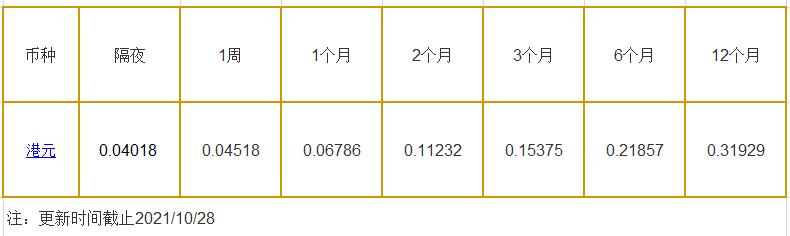 10月28日香港银行间同业拆借利率港币: