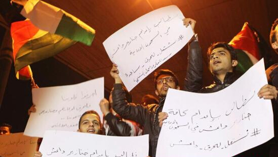 当地时间2月3日,约旦首都安曼,愤怒的抗议群众。约旦军方3日宣布,被极端组织“伊斯兰国”劫为人质的约旦飞行员卡萨斯贝已遭杀害,约旦军方将采取强有力的报复行动。据约旦电视台报道,卡萨斯贝早在上月即被“伊斯兰国”杀害。